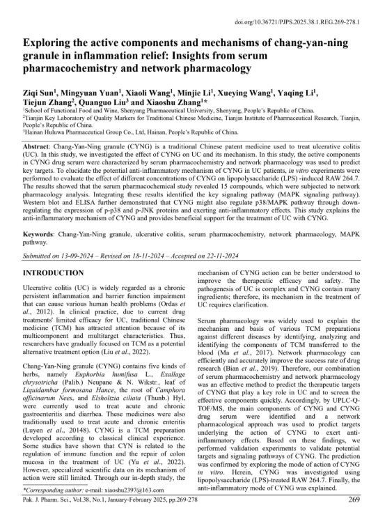 此次发表的文章题为《肠炎宁颗粒缓解炎症的物质基础和药理机制:血清药理学与网络药理学综合研究》,刊登于巴基斯坦制药科学杂志(Pak. J. Pharm. Sci.)。该研究深入探讨了肠炎宁颗粒(CYNG)在治疗溃疡性结肠炎(UC)中的作用机制,通过血清药理学和网络药理学的综合方法,揭示了其抗炎活性成分及关键信号通路,为肠炎宁颗粒的临床应用提供了坚实的科学依据。